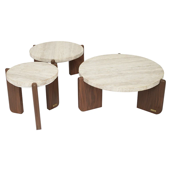 The Soho Coffee Table Set blends natural materials with sculptural design to create a bold yet balanced statement. Each table is topped with luxurious travertine stone in soft, earthy tones and grounded by a solid wood base in a rich walnut finish. Designed in three sizes with varying heights, they can nest together or stand alone, offering flexibility, warmth, and visual depth. A grounded yet elevated addition to any living space.